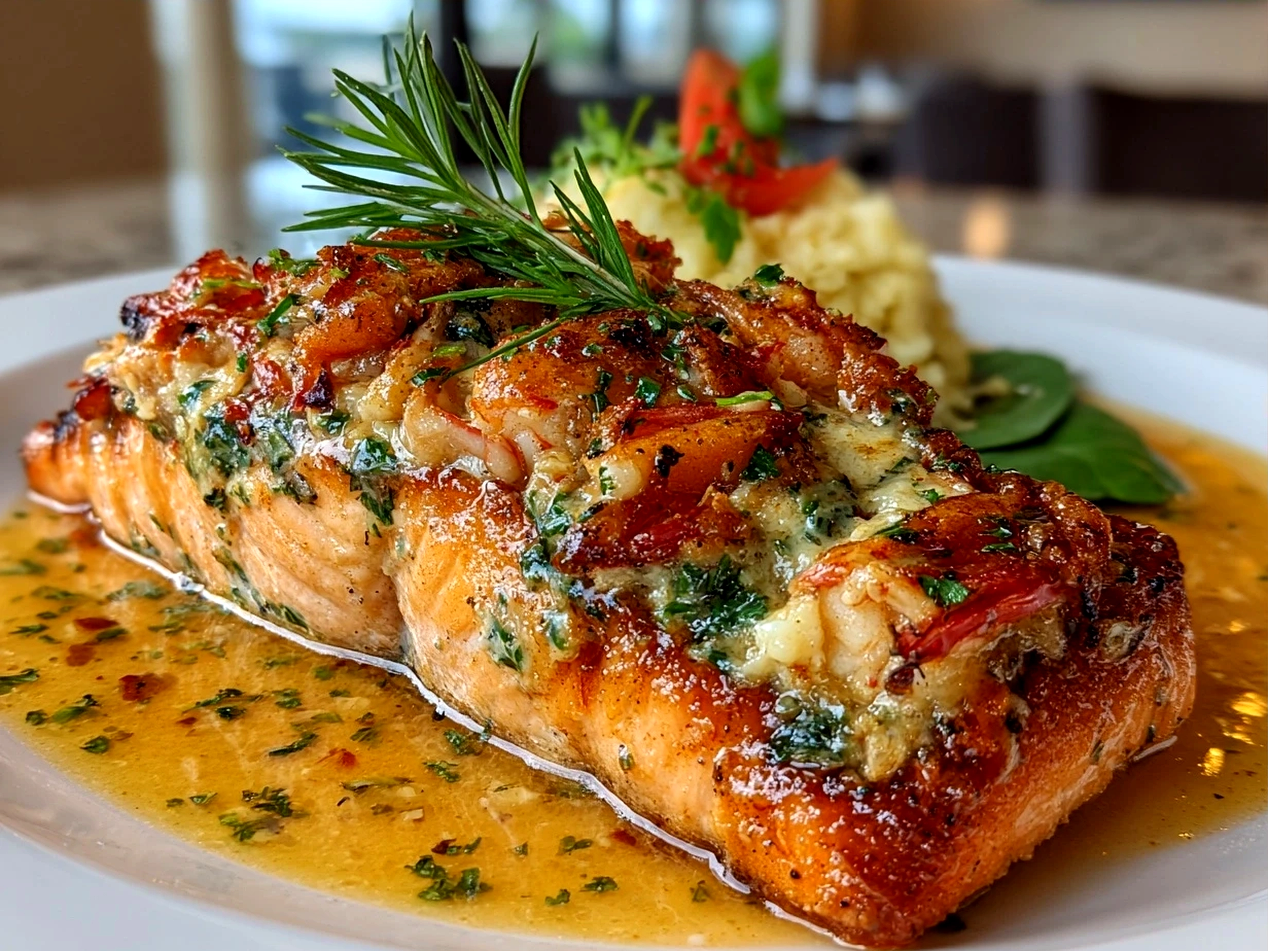 How do I know when my Crab And Shrimp Stuffed Salmon is properly done? The salmon’s surface should be opaque with a slight flake when tested with a fork. The crab shrimp filling should feel warm but creamy, not dry or crumbly.