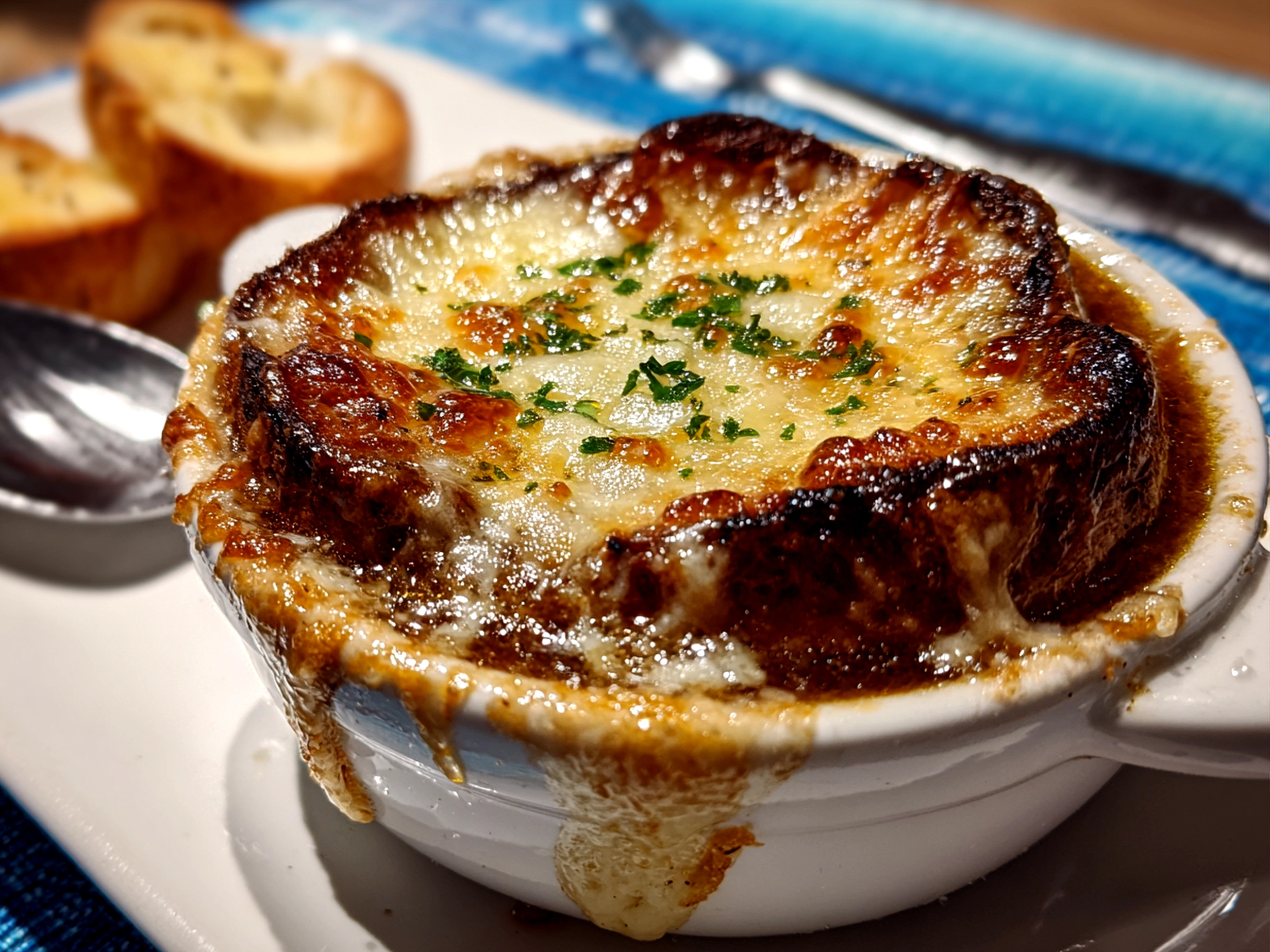 7. Ladle soup into ovenproof bowls; top each with toasted baguette slices and a generous amount of Gruyère cheese.