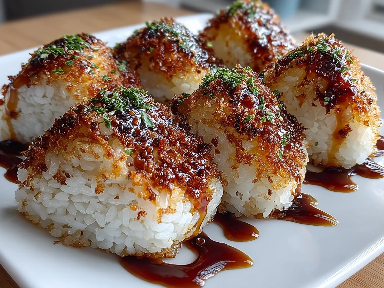 - Brush the soy sauce mixture onto each rice ball and cook for an additional 1–2 minutes per side to caramelize the sauce.