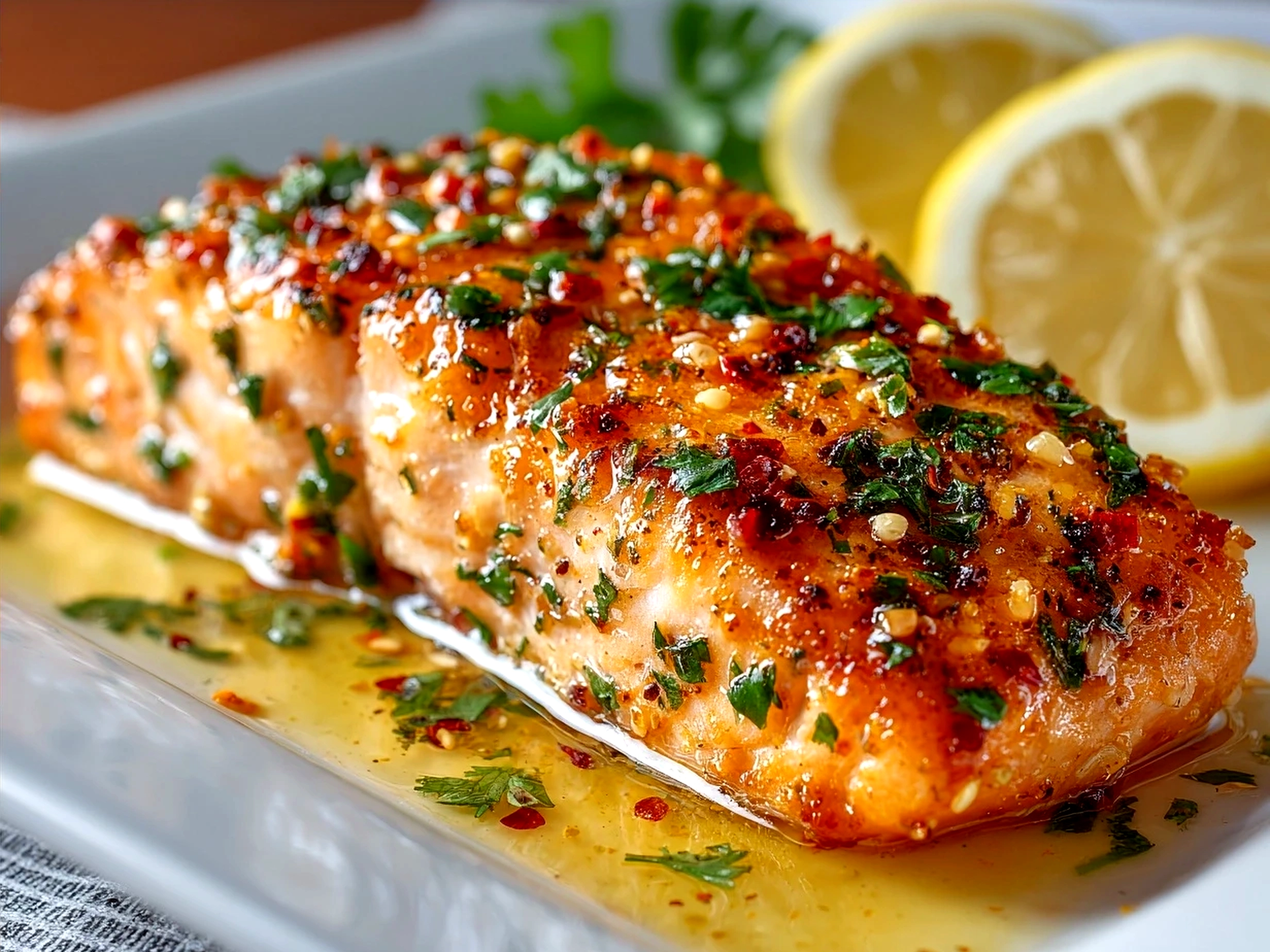 5. Remove the skillet from heat. Add the remaining lemon juice and freshly chopped parsley, mixing to create a creamy garlic lemon salmon sauce that coats the fish. This final step turns the moment from simple cooking to something memorable and fragrant.