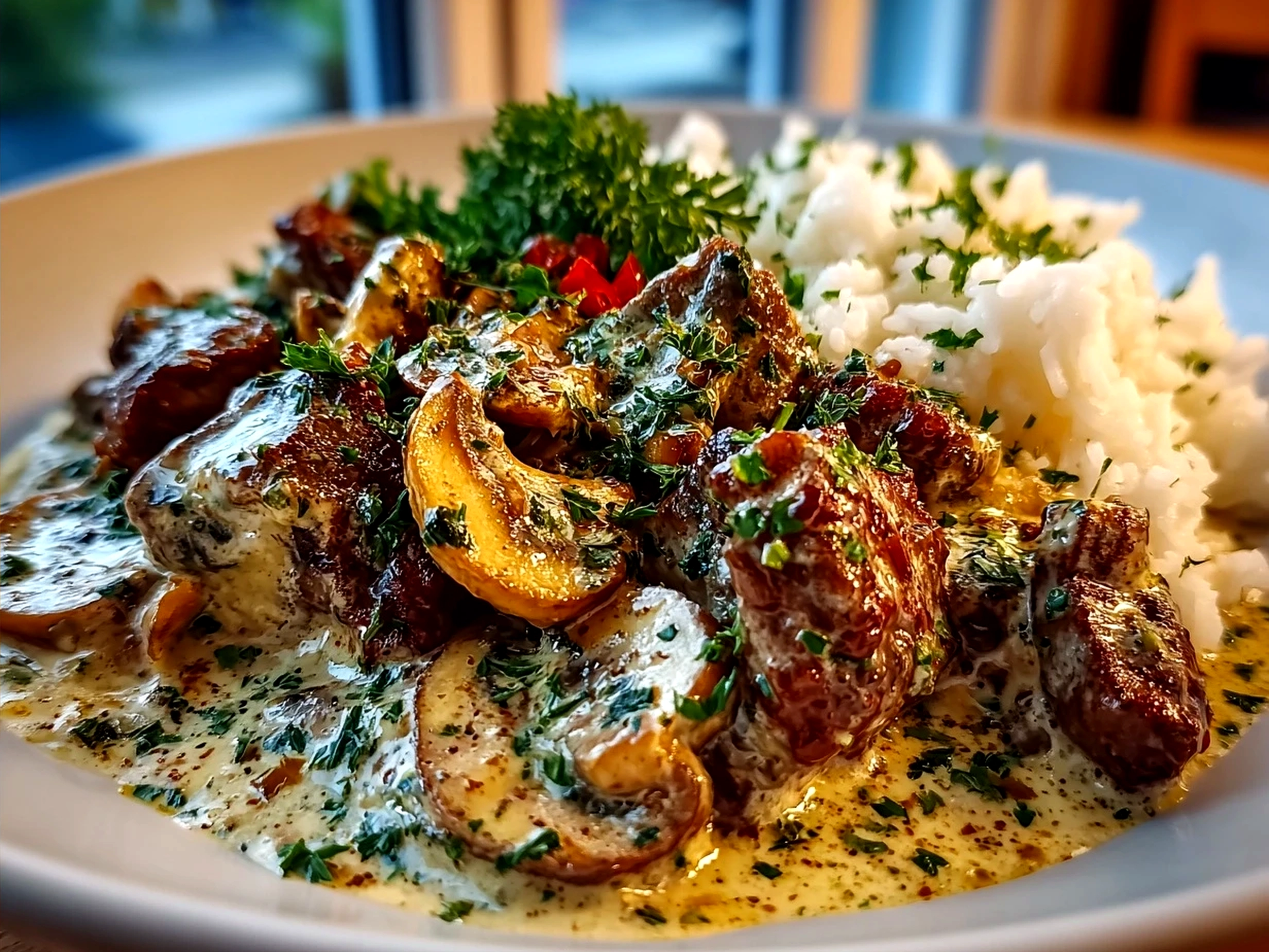 The beef should be browned on the outside but still tender and pink inside, preventing dryness. The mushrooms must be deeply caramelized but not burnt, just right to enrich the sauce. The beef stroganoff sauce thickens slightly but remains saucy, not gluey. Texture and aroma guide you—the rich, savory scent with a hint of tang signals readiness.