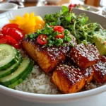 This Honey Glazed Salmon Bowl features tender salmon fillets coated in a sweet, sticky honey glaze served over a bed of seasoned rice and fresh vegetables, offering a perfect balance of flavors for a wholesome meal.