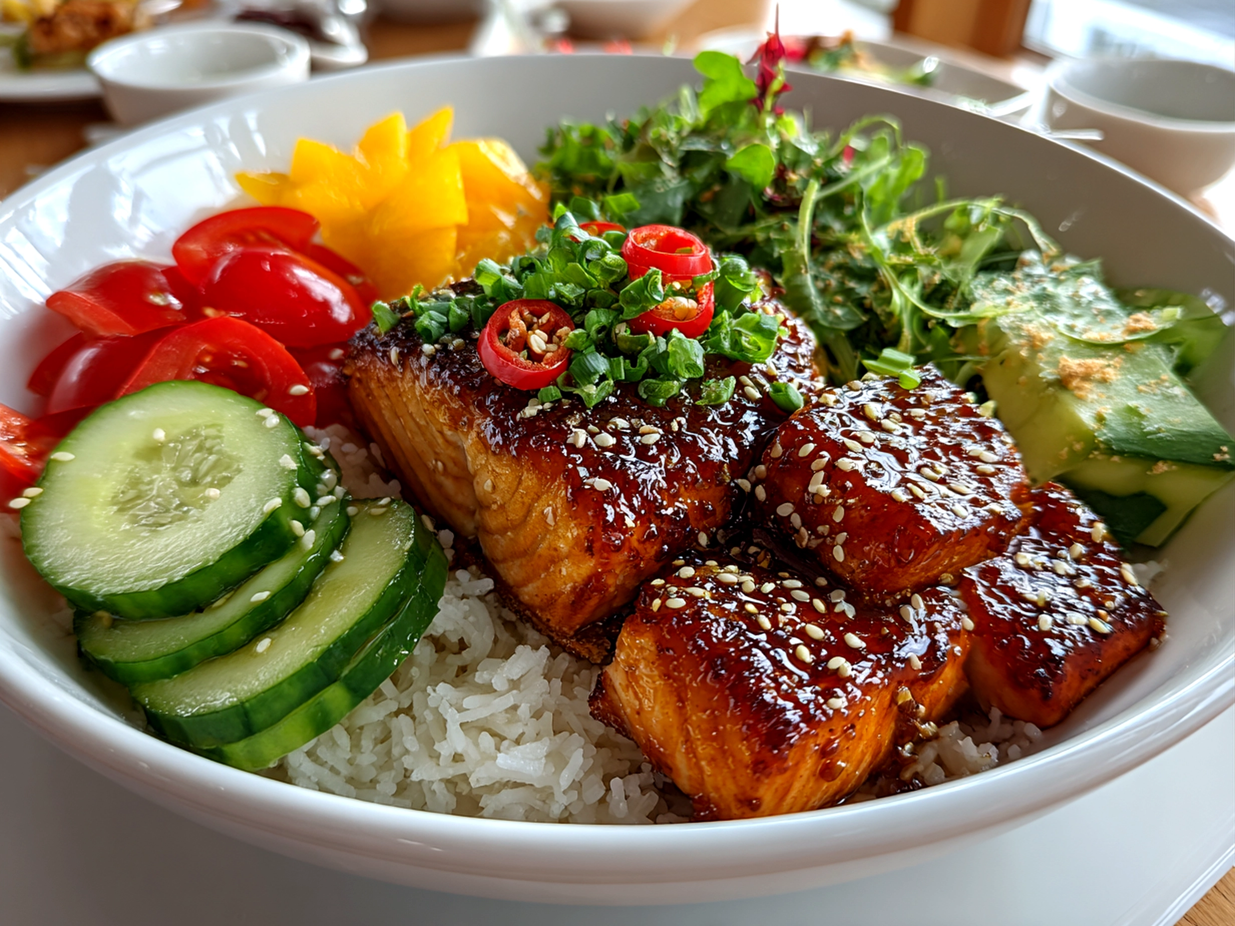 6. Assemble the bowl: Spoon cooked rice into bowls, arrange vegetables on one side, place salmon on top, and drizzle any reserved glaze. Sprinkle with sesame seeds and green onions to finish.