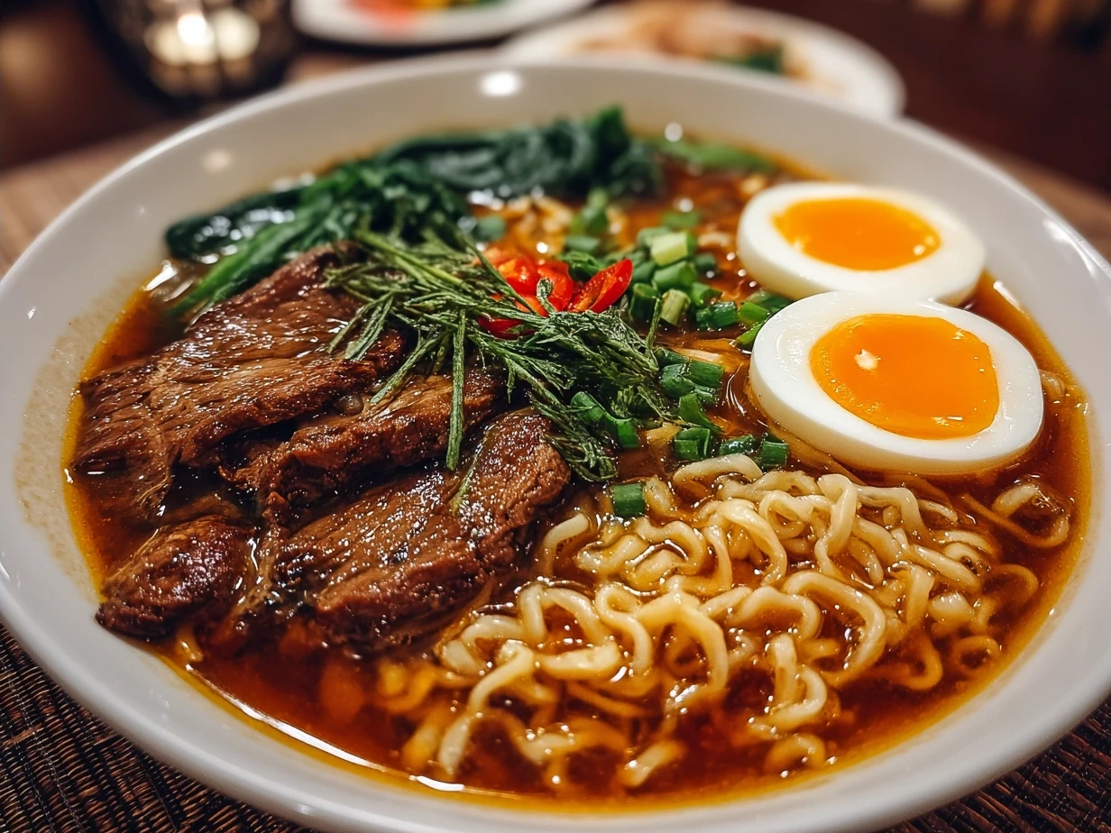 This comforting Ramen Noodle Soup features a rich, savory broth with tender noodles and flavorful toppings, perfect for a quick and satisfying meal.
